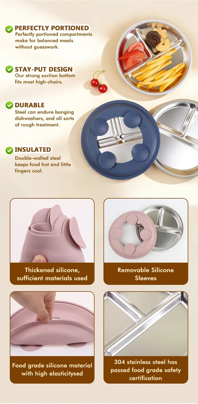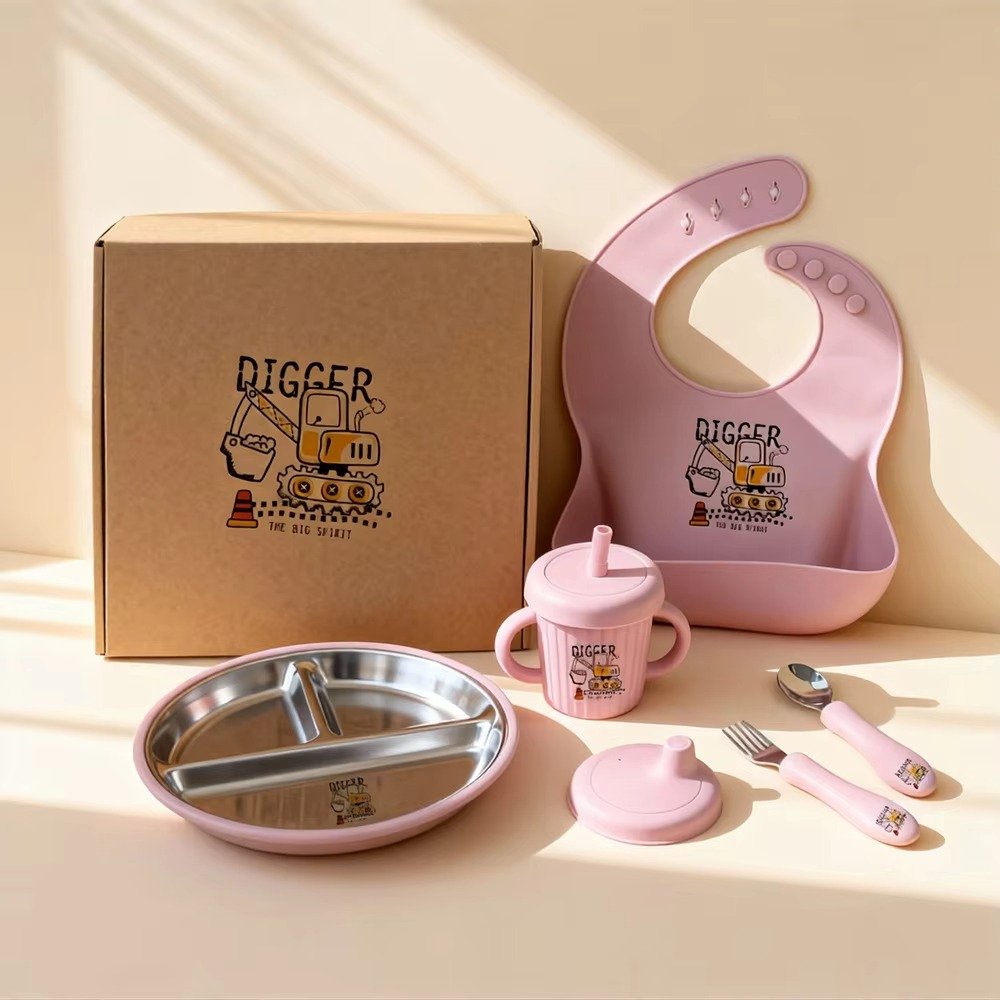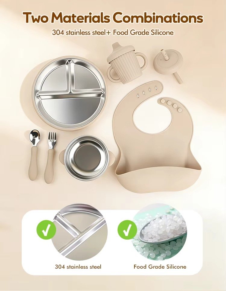 طقم تغذية للأطفال من السيليكون والفولاذ المقاوم للصدأ – طبق شفط + وعاء + مريلة